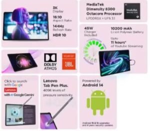 Lenovo Idea Tab Pro అనేది విద్యార్థులు మరియు రోజువారీ వినియోగదారుల కోసం రూపొందించబడిన శక్తివంతమైన మరియు బహుముఖమైన టాబ్లెట్. ఇది అధునాతన ప్రాసెసర్, అధిక-రిఫ్రెష్ రేట్ డిస్‌ప్లే, మరియు దీర్ఘకాలిక బ్యాటరీ లైఫ్‌తో వస్తుంది, ఇది చదువు, పని మరియు వినోదం కోసం అనుకూలంగా ఉంటుంది.